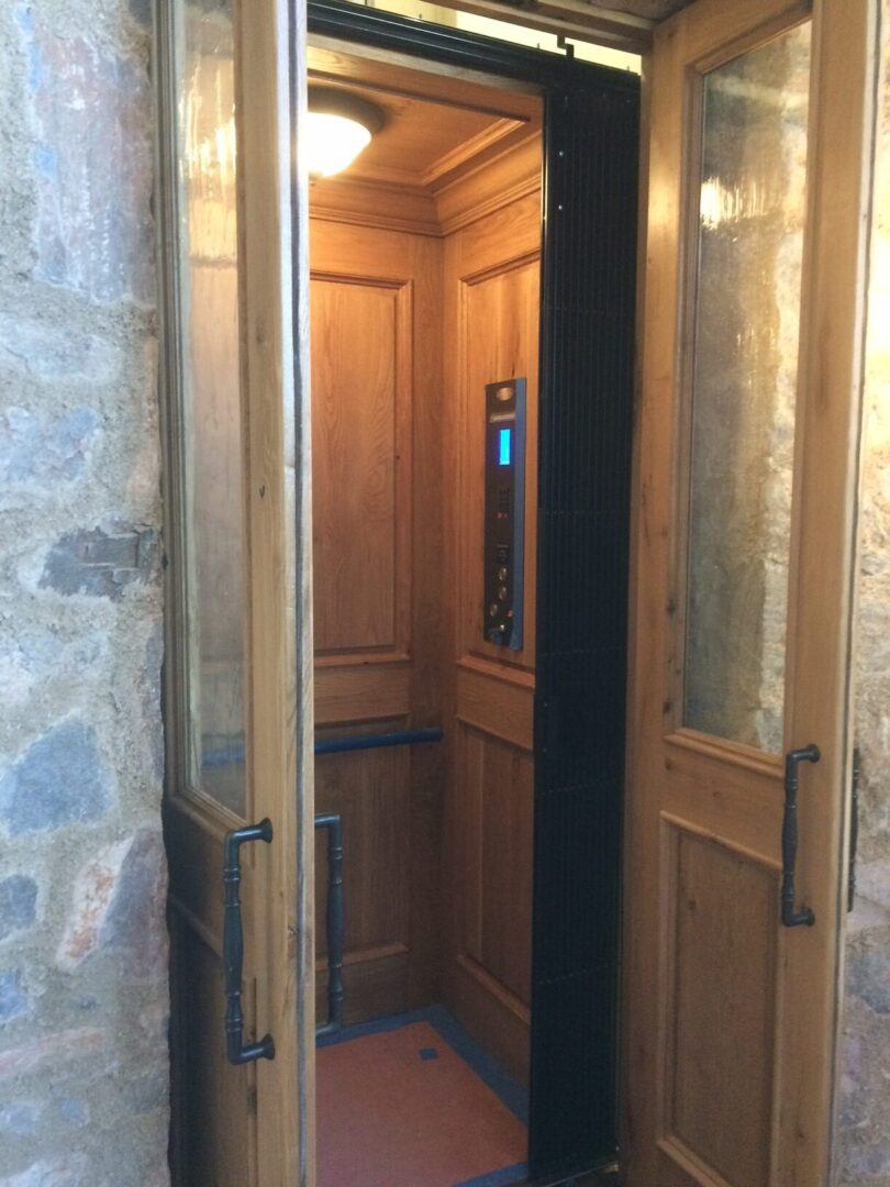 Wood-paneled residential elevator with open doors
