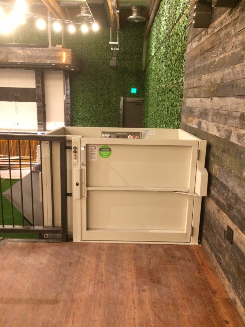 Indoor wheelchair platform lift against green wall