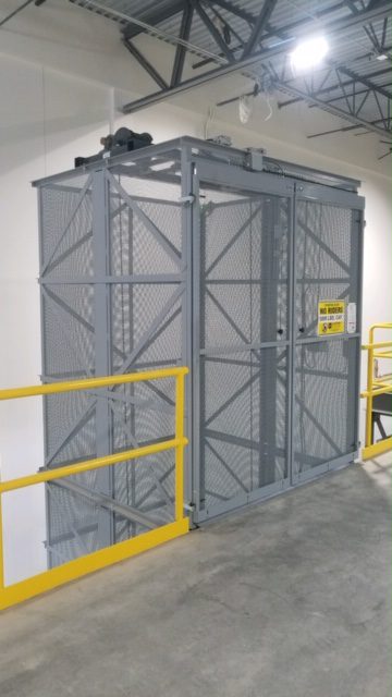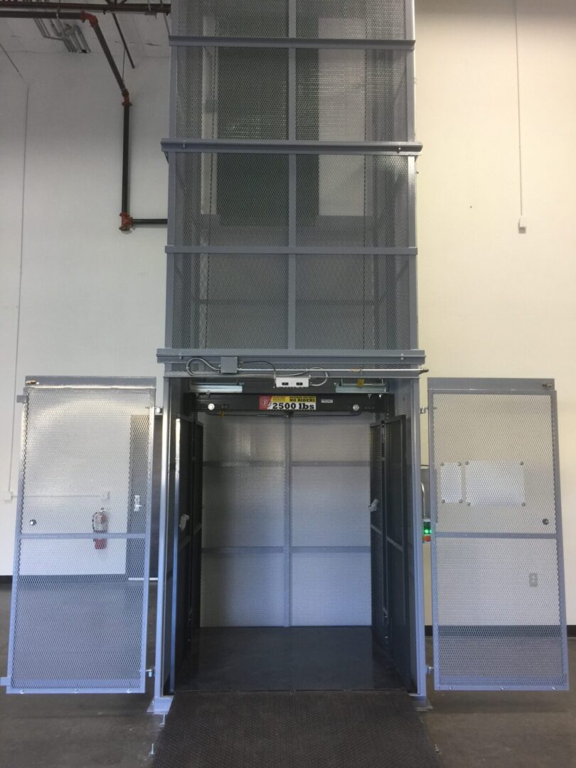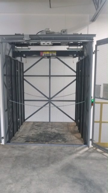industrial freight elevator with open mesh doors