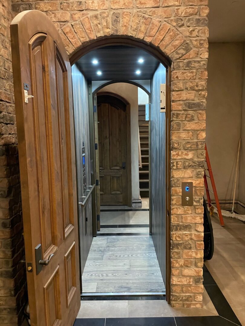 Wooden home elevator under brick archway