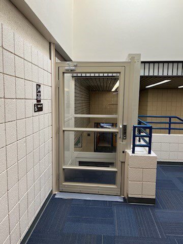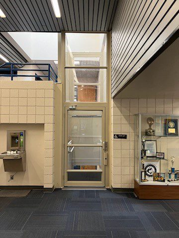 School lobby with trophy case and glass door
