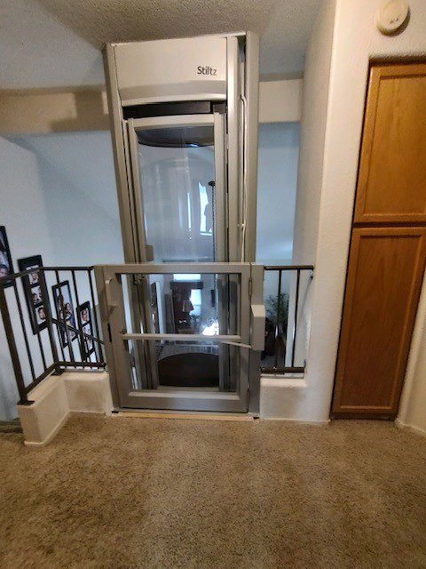 Open residential elevator with carpeted interior