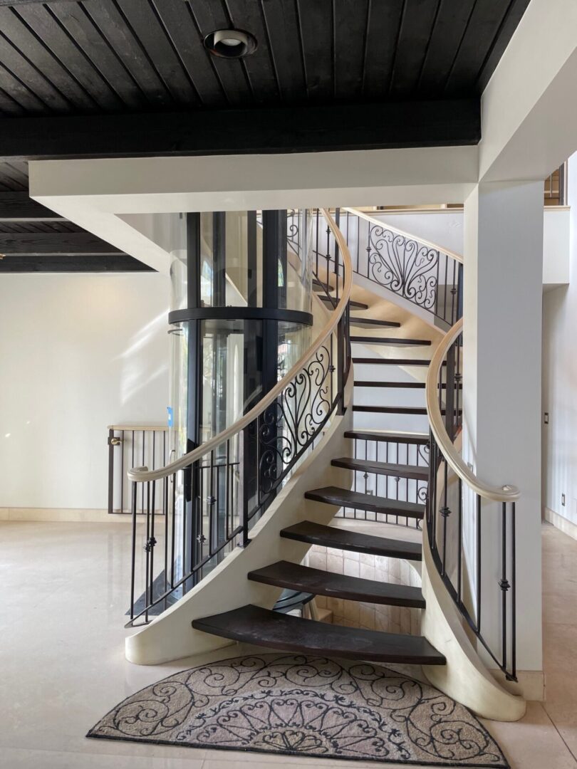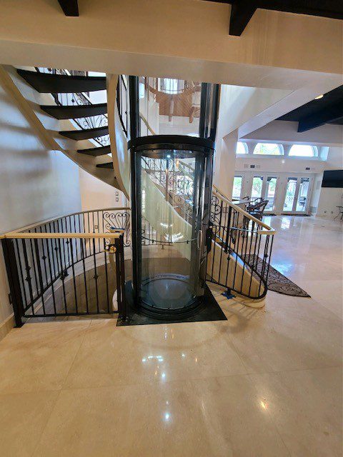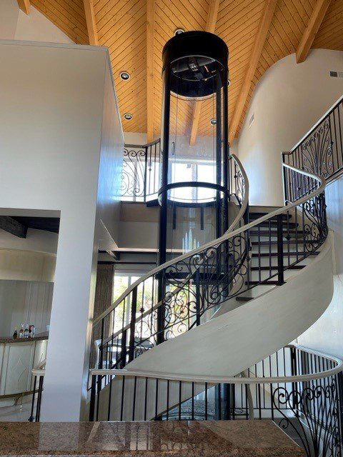 Cylindrical glass home elevator beside spiral staircase
