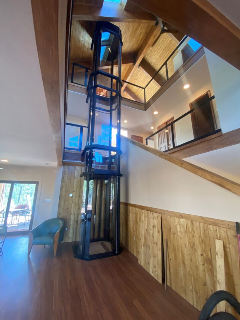 Glass home elevator in two-story wooden interior