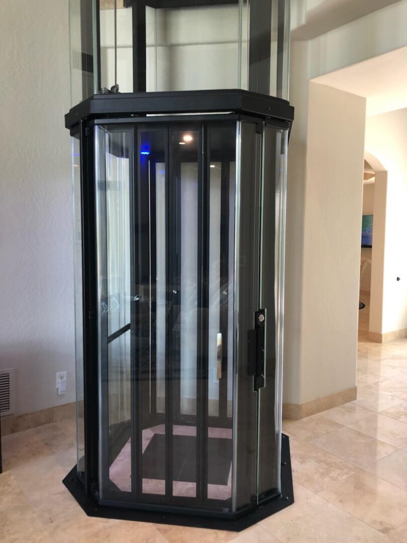 Glass home elevator with black metal frame