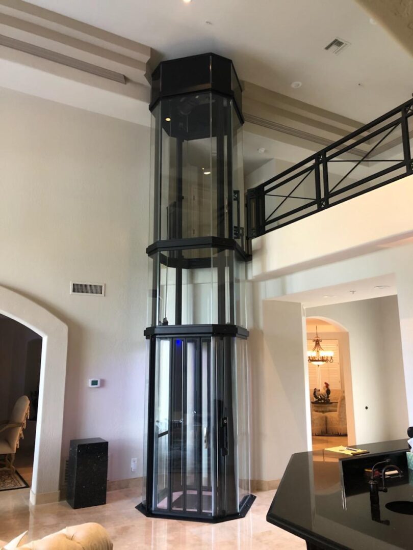 Glass home elevator connecting floors in living room