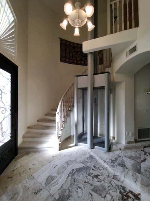 Marble foyer with spiral staircase and elevator